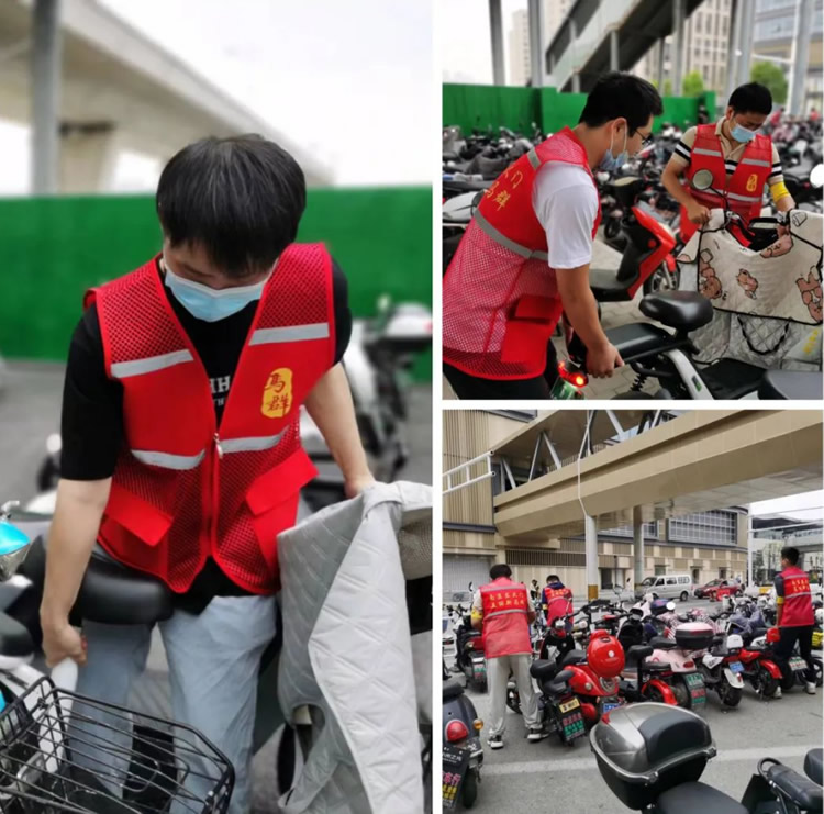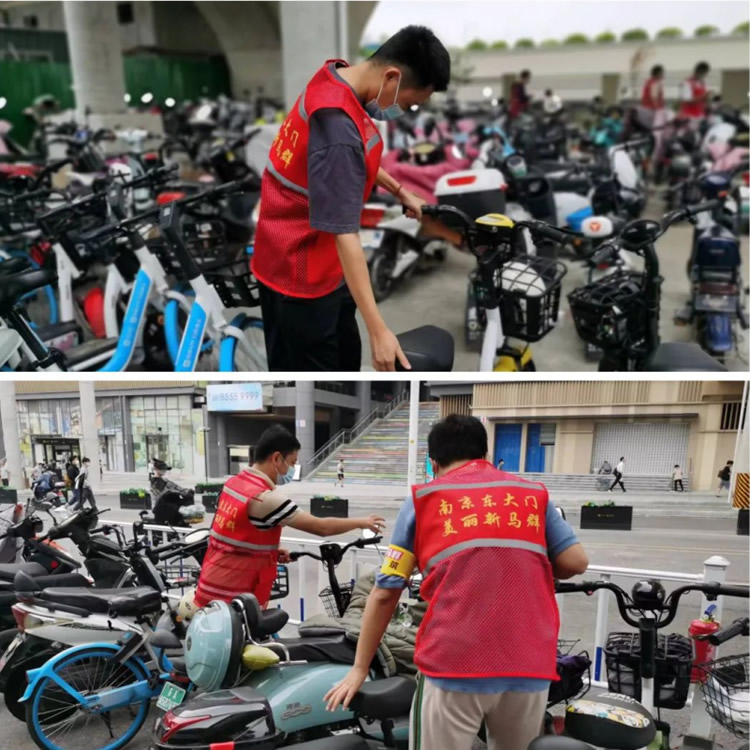另一邊,元帥班和初心班的男干部也不甘示弱。面對(duì)停放雜亂的電動(dòng)車,他們互相配合,合作整理,并引導(dǎo)正在停車的車主有序停放。原本略顯雜亂的停車區(qū)很快變得井井有條起來(lái)。