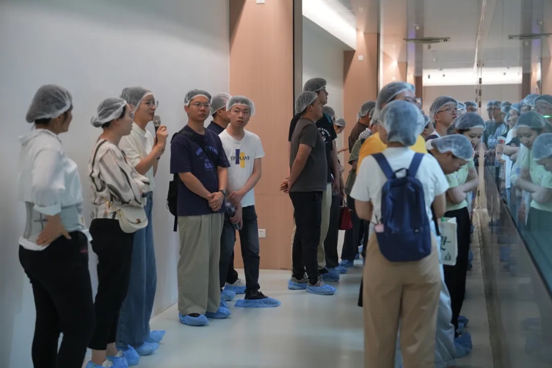 活動伊始,大家穿戴好一次性帽子和鞋套進入了車間,一股淡淡的甜香撲鼻而來,那是糕點烘焙后散發(fā)出的誘人香氣。大家沿著整潔的生產(chǎn)線參觀,看到工人們身著統(tǒng)一的工作服,手法熟練地進行著各道工序。通過生產(chǎn)負責(zé)人的講解,大家了解了合和圓緣工廠的材料使用、制作工藝、冷鏈運輸?shù)雀髁鞒痰墓ぷ饕?guī)范和要求,也見微知著地感受到了合和圓緣細節(jié)體現(xiàn)的匠人追求和專業(yè)素養(yǎng)。