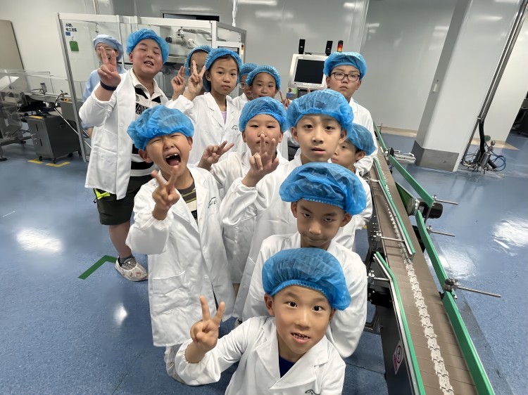 緊接著孩子們來(lái)到了小容量注射劑1號(hào)車間。在進(jìn)入生產(chǎn)區(qū)的剎那,透過巨大的玻璃展窗,孩子們發(fā)出陣陣驚嘆——儲(chǔ)水罐猶如高大威猛的巨人,佇立在光亮整潔的制水間內(nèi)。注射液的誕生之路便從這里開始。在滅菌間內(nèi),孩子們對(duì)巨大的鐵柜子充滿了好奇,它就是飽和蒸汽滅菌柜,是藥支“蒸桑拿”的地方。孩子們?cè)谶@里學(xué)習(xí)到了溫度與微生物之間的親密關(guān)系。在燈檢間內(nèi),巨大的星輪圓盤與隊(duì)列整齊的藥支們?cè)V說著質(zhì)量第一的故事。最后,在包裝間內(nèi),從分托入托機(jī)到裝箱機(jī),藥支們陸續(xù)穿上漂亮的服裝,成功誕生為完整的產(chǎn)品。孩子們了解到,每一支注射劑的誕生,都是科技與智慧的結(jié)晶,是保護(hù)人類健康的超級(jí)英雄。