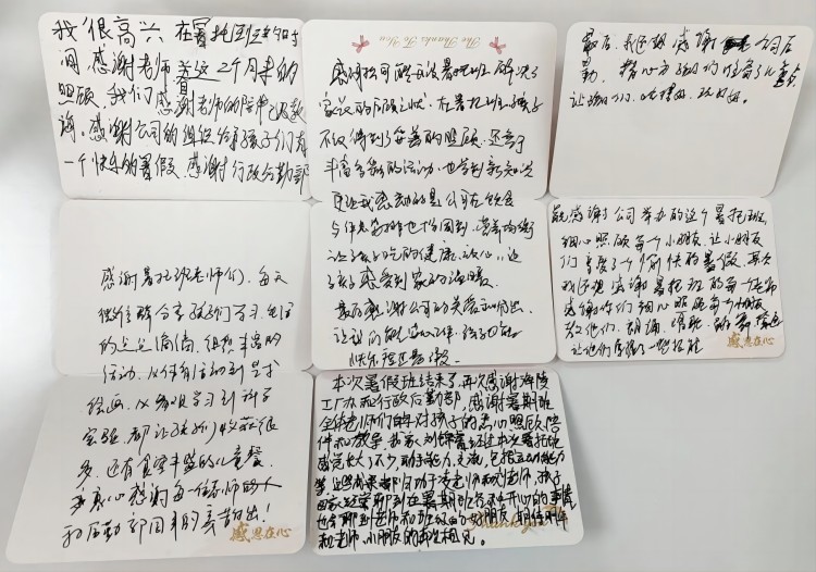 現(xiàn)場每一位家長都手寫了對暑托班的感謝信。有的家長情感細膩,賦詩一首,用優(yōu)美的詩句表達了對暑托班深深的感激之情;有的家長則先打好了草稿,再滿滿當當?shù)刂`寫到卡片上,每一個字都凝聚著對暑托班老師及工作人員的敬意與感謝。這些感謝信,如同一幅幅溫馨的畫面,展現(xiàn)了家長與暑托班之間深厚的情感紐帶。