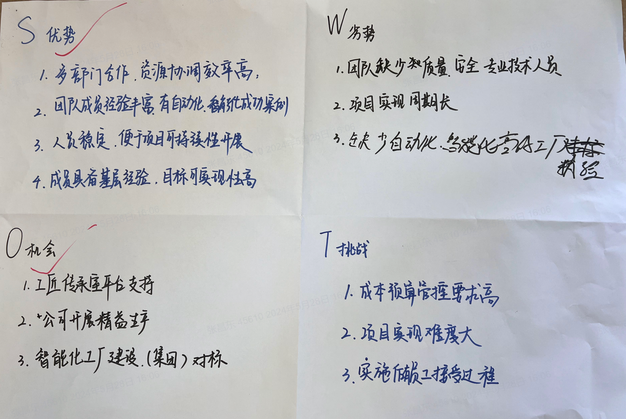 5月28日,海陵8個工匠傳承室參與了2024-2025年度的行動學習共創(chuàng)會,各自明確了本傳承室新一年度目標,碰撞出思維火花,共創(chuàng)分解指標。其中王志鵬傳承室深知,在快速變化的工業(yè)4.0時代,自動化與智能化是提升生產效率、保證產品質量的關鍵。因此,他們將目光聚焦于未來,確立了打造自動化智能車間的愿景。這一愿景不僅承載著對技術進步的追求,更蘊含著對工匠精神的傳承與創(chuàng)新?;谠妇?,王志鵬傳承室設置了三個關鍵目標,進行了SWOT分析與策略制定。