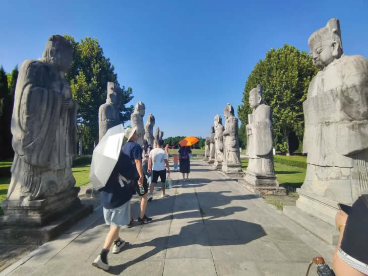 中午,大家在農(nóng)家樂品嘗了當(dāng)?shù)靥厣↓埼r,隨后坐車前往第二站明祖陵。這里被譽為全國唯一一座水下皇陵,承載了朱明興衰的塵煙。工匠與家屬們漫步在陵墓神道之上,在講解聲中觀察幾百年前的石刻群像,體會其中的歷史余韻與時代遺音。石像歷經(jīng)幾百年時光仍然細(xì)節(jié)豐富、栩栩如生,然而六朝舊事隨流水,百年帝業(yè)亦成空。
